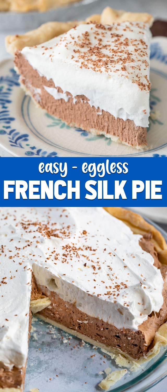 A French Silk Pie is the perfect easy chocolate cream pie recipe! The filling is rich, smooth, creamy, and super chocolatey with fresh whipped cream on top and no eggs. I call it a heavenly pie recipe!