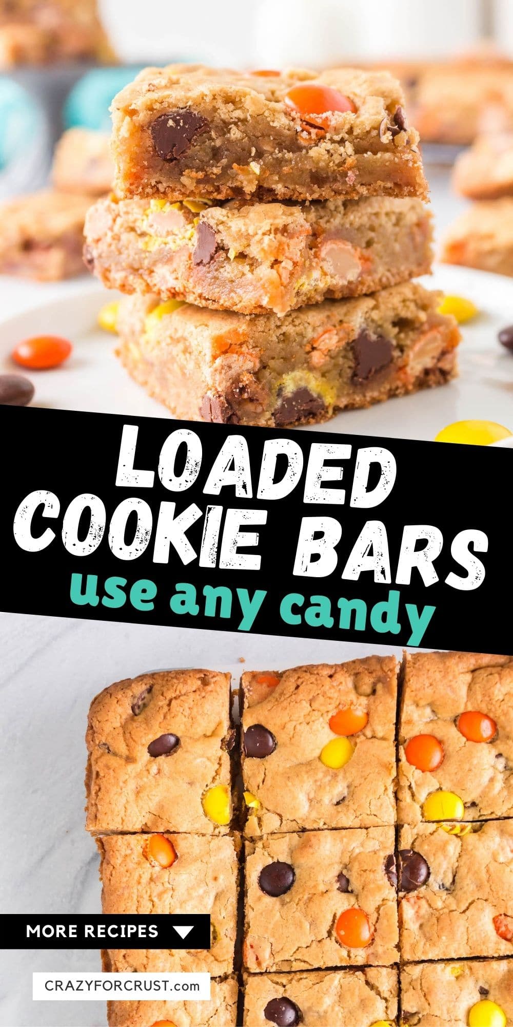 Loaded Cookie Bars are the perfect easy bar cookie recipe to make when you want to clean out your pantry – add any candy or nuts or chips to make your favorite soft and chewy cookie bars.