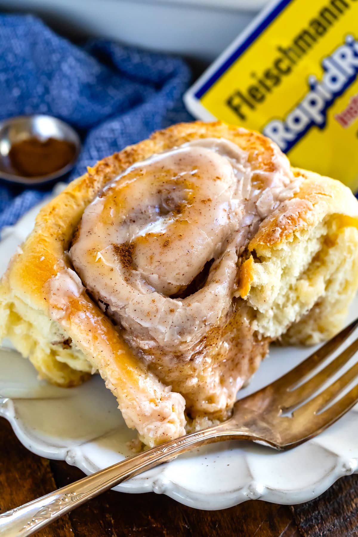 cinnamon roll on white plate with blue napkin behind and fork