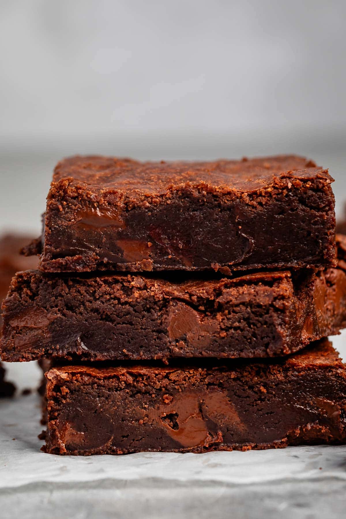 The eggs add tons of moisture, making these super fudgy brownies that have 3 kinds of chocolate: baking chocolate, cocoa powder, and chocolate chips. These are rich and delicious and everyone who tries them raves about how good they are. They have crackly tops, are chewy with moist crumbs – they’re taste a million times better than that boxed brownie mix you normally use.